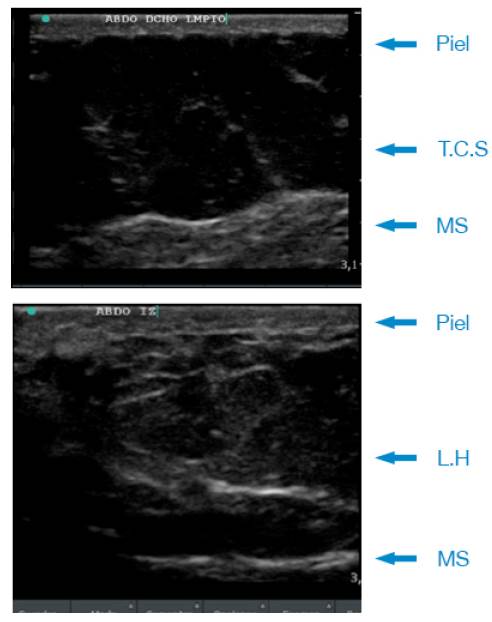 La ecografía de pared abdominal confirmó la presencia de cambios compatibles con LH e infiltración grasa de la pared muscular. La Figura 1 muestra un ejemplo de los cambios específicos evidenciados por ultrasonido e identificados como signos radiológicos para esta entidad 7.