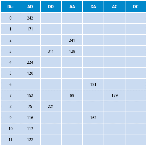 AD: antes de desayuno; DD: después desayuno; AA: antes del almuerzo; DA: después del almuerzo; AC: antes de la comida; DC: después de la comida. Fuente: Elaboración propia.