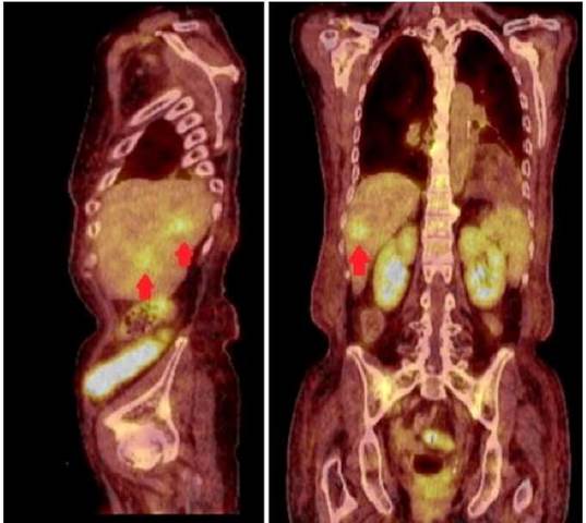 Figure 1: Positron emission tomography with 18fluor-fluor-deoxy-glucose. In the sagittal section (left), the arrows point to two hypermetabolic lesions in segments V and VII of the liver. The coronal section (right) shows the largest lesion in segment VII of the liver.