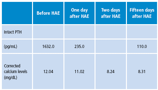 Table 1: PTH and serum calcium levels in the patient before and after hepatic arterial embolization of metastatic lesions (HAE).