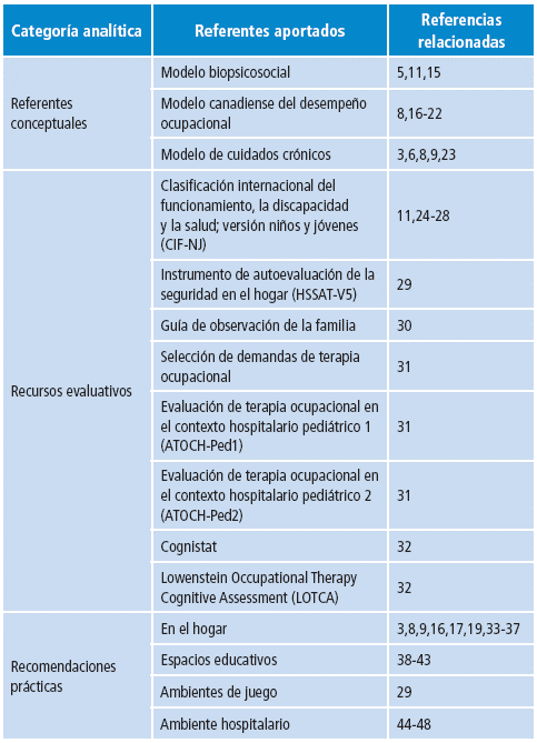Los referentes conceptuales mencionan la importancia de un enfoque centrado en el niño y la familia, así como de su empoderamiento en el proceso de manejo de la condición de salud crónica. Las herramientas evaluativas muestran suficiente disponibilidad de instrumentos formales aplicables a esta población y dan cuenta de variadas estrategias y recomendaciones prácticas, aplicables a niños en distintas áreas ocupacionales y escenarios donde se desarrolla su cotidianidad.