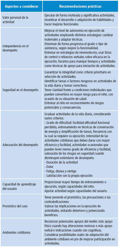 Desde la terapia ocupacional se reconoce una serie de criterios que deben acompañar las actividades centradas en el usuario para lograr mejores resultados en sus ejecuciones y asegurar el bienestar al realizarlas (Tabla 2) 33.