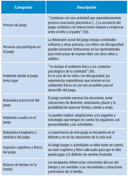 Una vez que se reconocen los espacios de juego en los que se incluyen elementos sociales, físicos y de valores familiares, se puede emplear el juego familiar como parte de un proceso terapéutico, por lo cual es importante identificar las categorías necesarias para hacer provechosa esta área ocupacional (Tabla 3).