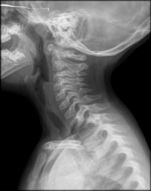 Chest and neck radiographs were requested for an initial approach (Figure 1 and 2). The radiology service found a steeple sign that suggested laryngeal croup in the anteroposterior (AP) projection of the second image. Likewise, the lateral projection shows an object that could be a foreign body. Chest X-ray was normal.