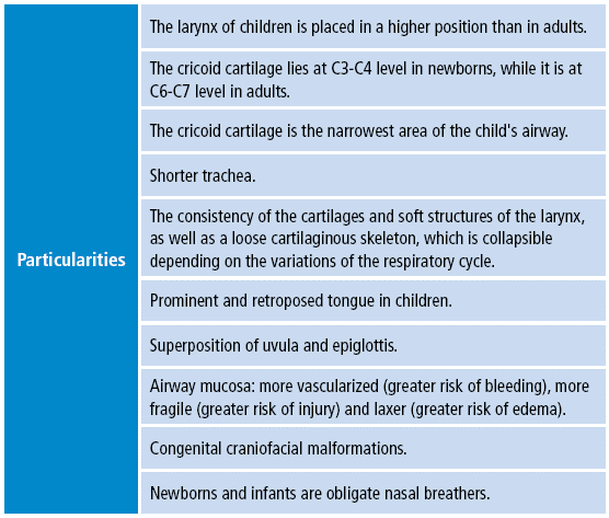 The anatomy of the airway differs between children and adults 15,16. Basic physical principles have been described to explain predisposition to obstruction and difficult management of the airway in pediatrics 10. Resistance to air passage is inversely proportional to the airway radius, raised to the fourth power, therefore reducing airway diameter by half will increase resistance 16 times. According to this principle, Table 1 shows the reasons why obstruction in the upper airway is more frequent in pediatrics.