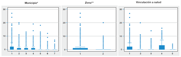 Igual que para los criterios del nivel individual evaluados en la segunda tabla, para municipio, zona de residencia y vinculación al sistema de salud (nivel colectivo), la mediana de citas a las que asistieron las mujeres gestantes fue de cero, lo que revela que la mitad de las gestantes no habían recibido atención odontológica (Tabla 3 y Figura 1).