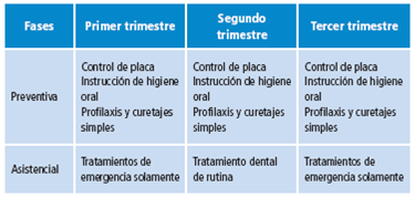 Tabla 1: Atención odontológica a la paciente embarazada según fase y trimestre.