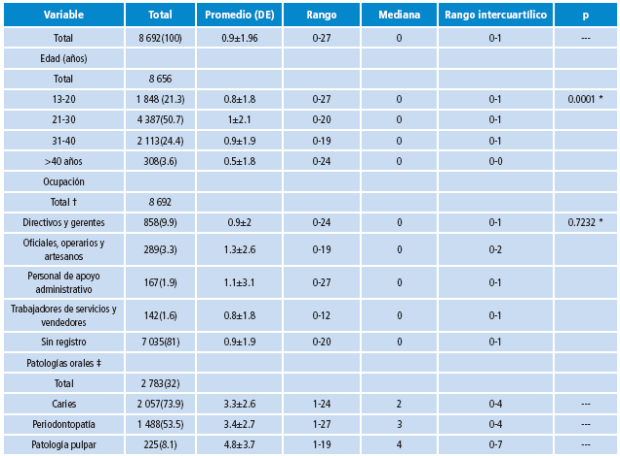 En la información de las 8 692 mujeres embarazadas registradas en la base entregada por el OSPS, predominaron las mujeres en el rango de 21 y 30 años (50.7%) y solo 3.6% eran >40 años. Al referir ocupación, en el 81% no se reporta este criterio y en el 9.9% (858) se catalogan como directivas o docentes. Del total de las mujeres que asistieron a la consulta (2 783), 73.9% acudieron a la consulta odontológica por caries, 53.5% por periodontopatías y 8.1% por patologías pulpares. Por edad, el grupo de mujeres con la media más baja de citas odontológicas (0.5±1.8) se evidenció en las >40 años. Al analizar por ocupación, las trabajadoras de servicios y vendedores registraron igual situación (0.8±1.8), mientras que las mujeres que registraron patologías pulpares tuvieron el promedio más alto de citas odontológicas.