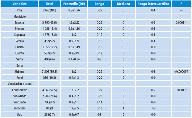 El grupo de embarazadas de Bucaramanga (municipio especial, por su mayor desarrollo social y económico) registró la mayor frecuencia de mujeres con 3 790 (43.6%) evaluadas y tuvo el promedio más alto en el número de consultas odontológicas (1.2±2.22). En cambio, se observó que en los municipios de cuarta, quinta y sexta categoría (menor desarrollo social económico) hubo medias del número de citas odontológicas de 0.5, 0.3 y 0.4, respectivamente. Del mismo modo, la media de número de citas odontológicas fue más baja en las mujeres que residen en la zona rural (0.4±1.2). Opuesto a esto, las mujeres que recibieron atención odontológica y que asistieron como particulares registraron una media cercana a dos citas odontológicas.
