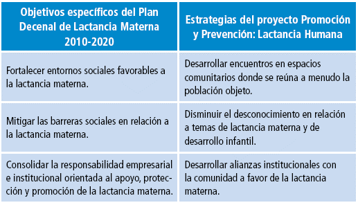 Con base en el desarrollo del plan decenal de lactancia materna en ámbitos comunitarios y desde la carrera de Fonoaudiología en la Universidad Nacional de Colombia, surge el interés por desarrollar una iniciativa piloto que relacione los procesos de alimentación. El desarrollo de patrones oromotores, del lenguaje, del habla, de la cognición en la infancia y del hacer profesional dado en comunidad, con la consejería en lactancia humana y los objetivos propuestos en el proyecto y el marco del Plan Decenal de Lactancia Materna 2010-2020, se describen en la Tabla 1. Esta propuesta es una iniciativa enmarcada en el proyecto denominado "Promoción y Prevención: Lactancia Humana", que propone la creación de espacios de consejería encaminados a generar empoderamiento, gracias a la participación activa durante el proceso, y dirigidos a madres lactantes y gestantes adolescentes o en algún grado de vulnerabilidad; estos espacios permiten la promoción y prevención de dificultades comunicativas o de alimentación enmarcadas en el hacer de la fonoaudiología en Colombia respecto a la LH. Durante la ejecución del proceso operativo del proyecto, fue necesario establecer alianzas estratégicas con distintas instituciones aliadas, las cuales contribuyeron en la generación de espacios para el desarrollo de los grupos de apoyo propuestos.