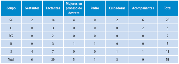 Se evidenció un total de 53 participantes en las que se encontraron madres lactantes, madres gestantes, madres en proceso de destete, adolescentes y cuidadoras. En uno de los encuentros asistió el padre de un lactante (Tabla 2).
