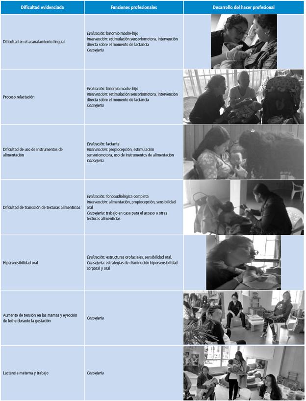 Se conformaron cinco grupos de apoyo con 53 participantes en total; se ejecutaron acciones profesionales en consejería grupal e individual, evaluación e intervención en diversos temas relacionados y en dificultades en lactancia humana y alimentación.