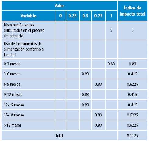 En los indicadores de impacto (Tabla 5), la equivalencia corresponde a 8,1125, lo que indica un alto nivel de impacto, ya que se identifica disminución de las dificultades en el proceso de lactancia y mayor prevalencia en los procesos de relactación con un 20%, dificultad en el agarre del pezón (10%), dolor en las mamas (10%) y reingreso al trabajo remunerado (10%). Los instrumentos de alimentación a utilizar incluyen: cuchara, vaso, pitillo, tetero y seno, elementos y procesos que deben ser usados y complejizados conforme a la edad, desarrollo oromotor y experiencia oral.
