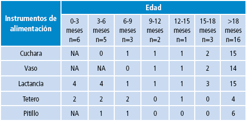 Tabla 6: Uso de instrumentos de alimentación en lactantes según edad.