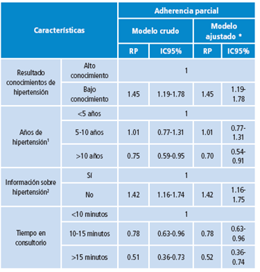 Se encontró asociación entre bajo conocimiento de hipertensión y adherencia parcial al tratamiento (RP=1.4; IC95%: 1.2-1.8), tener más de 10 años de hipertensión (RP=0.7; IC95%: 0.6-0.9), no haber recibido información sobre hipertensión (RP=1.4; IC95%: 1.2-1.7) y tiempo de consulta mayor a 15 minutos (RP=0.5; IC95%: 0.3-0.7).
