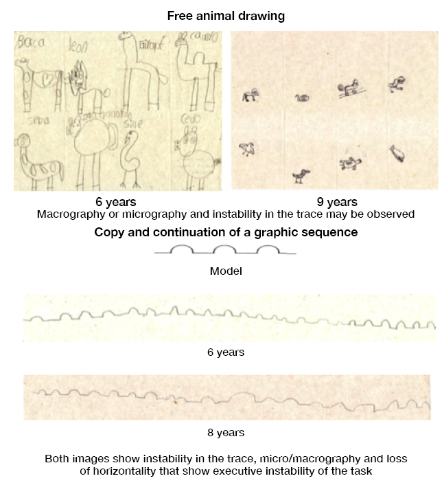 Results showed that executive instability during the evaluation allowed identifying insufficiency of the activation tone of the cerebral work. Therefore, in graphic-perceptive tasks, there is instability in the trace, as well as micrographs and macrographs. These types of errors have been identified in preschoolers and school children with ADHD in which functional weakness underlies the non-specific activation factor 8-10,13,14. Furthermore, Machinskaya & Semenova 20 identified difficulties in visual and auditory-verbal retention in schoolchildren aged between 7 and 8 years. These difficulties were related to information evocation without finding variability with age, which implies instability before the deficit 6.