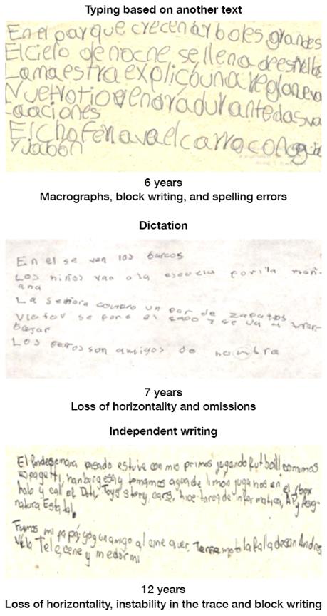 Figure 2 presents examples of the writing task and the most representative error types in schoolchildren of different ages.