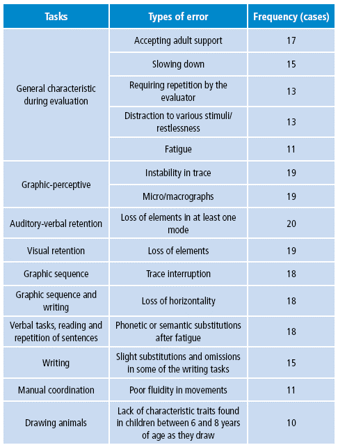 Furthermore, 10 types of errors were identified in more than 50% of the sample, mostly related to visual and auditory-verbal retention tasks, as well as graphic-perceptive, manual, verbal, reading and writing coordination tasks (Table 4).