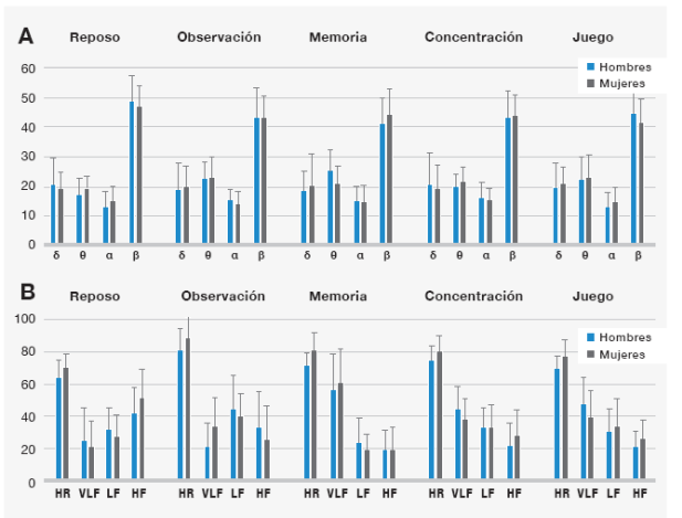 No se encontraron diferencias estadísticamente significativas en la distribución de la actividad electroencefalográfica entre hombres y mujeres, si bien en ambos grupos predominó beta a lo largo de toda la evaluación (Figura 2A). De la misma forma, tampoco se observaron diferencias en las variables asociadas a HRV y la HR. Aunque la HR fue superior siempre en mujeres, solo tuvo una diferencia significativa en la fase de memoria (p<0.01) y juego (p=0.02) (Figura 2B).