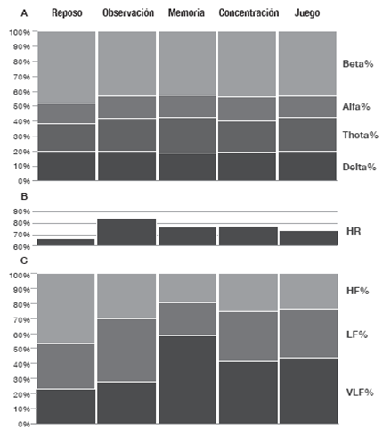 20 men and 19 women with a mean age of 21.2 (±2.32) were evaluated by electroencephalography (EGG) FP1-T3, FP2-T4 and electrocardiography (ECG) to determine heart rate (HR) and heart rate variability (HRV). The evaluation was made in five phases during rest, observation, memory, concentration and playing conditions. EGG and ECG signals were analyzed in the frequency domain using the Fast Fourier Transform (FFT). The differences between the variables found during each phase were established through a two-way ANOVA.