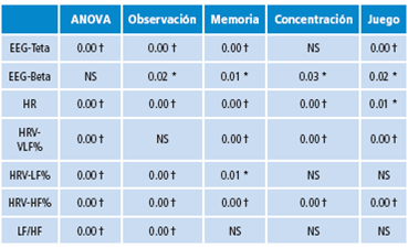 El análisis de la varianza mostró diferencias significativas entre las fases de la evaluación para el comportamiento de actividad teta. Para beta, las diferencias se observaron al comparar cada fase con el reposo. A su vez, la HR y la HRV mostraron diferencias significativas en la mayoría de las variables (Tabla 1).