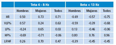 Tabla 2: Correlaciones entre los datos electroencefalográficos y datos de variabilidad de la frecuencia cardíaca.