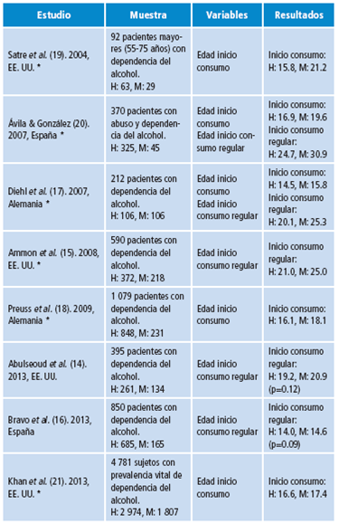 Como se observa en la Tabla 1, entre los estudios hallados que cumplen los criterios de selección, ocho analizan las diferencias de género respecto a la edad de inicio del consumo. De estos, seis emplean muestras de pacientes con dependencia del alcohol a tratamiento 14-19, uno incluye pacientes con abuso y dependencia del alcohol a tratamiento 20 y otro utiliza una muestra comunitaria de sujetos con prevalencia vital de dependencia del alcohol 21.
