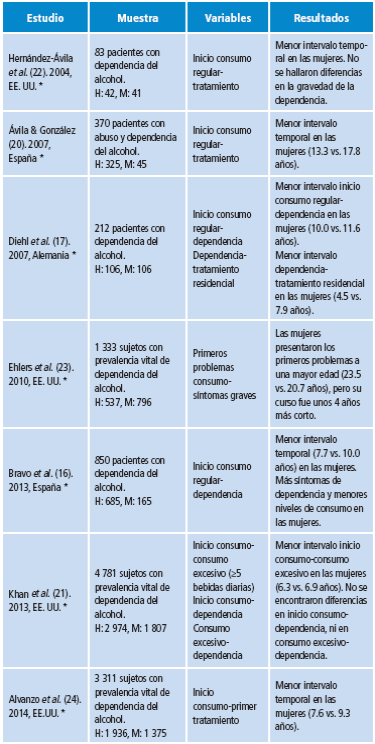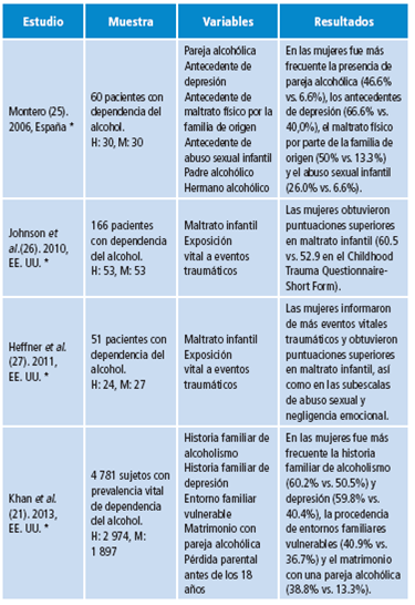 En la presente revisión se hallaron cuatro estudios que analizaban las diferencias de género respecto a los factores de riesgo del alcoholismo. De estos, tres emplearon muestras de pacientes con dependencia del alcohol a tratamiento 25-27 y uno utilizó una muestra comunitaria de sujetos con prevalencia vital de dependencia del alcohol 21.