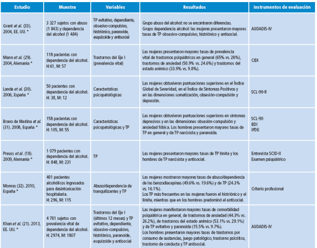 H: hombres; M: mujeres; TP: trastorno de personalidad; SCL-90-R: Symptom Checklist-90-Revised; BDI: Beck Depression Inventory; IPDE: International Personality Disorder Examination; CIDI: Composite International Diagnostic Interview; SCID-II: Structured Clinical Interview for DSM-IV Axis II Personality Disorders; AUDADIS-IV: Alcohol Use Disorder and Associated Disabilities Interview Schedule-DSM-IV. * Estudios que muestran diferencias estadísticamente significativas. Fuente: Elaboración propia.