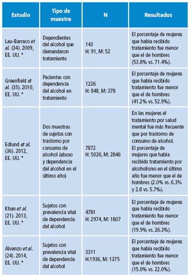En todas las investigaciones se examinó el uso previo de servicios asistenciales para el tratamiento del alcoholismo. Los resultados indicaron que el porcentaje de mujeres que habían recibido tratamiento previo para el alcoholismo era 6-18% menor que el de hombres 21,24,34,35. Respecto al último año, Edlund et al. 36 encontraron que el tratamiento por salud mental (depresión o ansiedad) fue más frecuente que el tratamiento por alcohol en mujeres con este trastorno. El porcentaje de mujeres que habían recibido tratamiento por problemas de alcohol en el año anterior a la realización del estudio fue menor que el de hombres (5.9% vs. 9.5% en el grupo de sujetos con diagnóstico de abuso de alcohol y 7.6% vs. 8.3% en el grupo de sujetos con dependencia del alcohol).