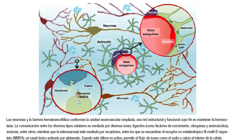 El encéfalo cuenta con un sistema celular integrado estructural y funcionalmente, conocido como unidad neurovascular ampliada, e incluye las células endoteliales, la musculatura lisa, los pericitos, los astrocitos y las neuronas; todo esto en el contexto de una red que interactúa de forma activa tanto en los procesos de homeostasis como en cuadros mórbidos de instauración aguda y de curso crónico (Figura 1) 10-12.