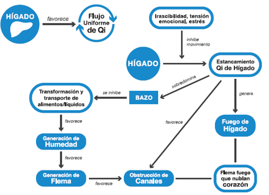 Según el ciclo de generación y control de los cinco movimientos, el hígado controla la función del bazo (que es la transformación y transporte de la energía obtenida de los alimentos) y la presencia de estancamiento de Qi de hígado puede lesionar esta función; al existir una sobre-dominancia (por el estancamiento de Qi, que es un exceso), se genera o exacerba la insuficiencia del Qi de bazo, evidenciado en una marcada disminución en la función de transformación y transporte de sustancias nutritivas y líquidos. El paciente manifiesta agotamiento, cansancio muscular, síntomas gastrointestinales como pesadez postingesta, variación del hábito intestinal entre estreñimiento y diarrea. Si la desarmonía se mantiene, genera humedad interna, que en presencia de calor da origen a la flema (Figura 5) 59.