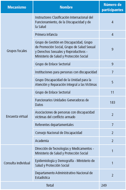 Para recopilar datos que justificaran los cambios a realizar en cada capítulo del RLCPD, se desarrollaron tres mecanismos de participación: grupos focales, consultas individuales y encuestas virtuales. Los participantes de cada mecanismo se categorizaron de acuerdo con los temas a debatir y las entidades más representativas. A los grupos focales se convocaron profesionales de diferentes áreas cuyos trabajos estuvieran relacionados con el tema de discapacidad y registro. Para las consultas individuales, se convocaron personas de sectores específicos que conocieran los mecanismos de implementación de los registros. Y, para completar las encuestas virtuales, se convocaron miembros de diferentes sectores y asociaciones. La Tabla 1 describe los mecanismos de participación diseñados para la recolección de datos y las temáticas consideradas para convocar a los participantes.