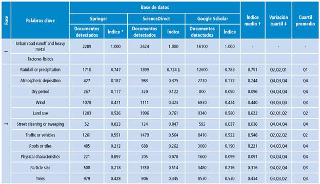 La primera fase de búsqueda se realizó para detectar artículos y libros en inglés sobre la contaminación metálica asociada con los SV. En la revisión bibliográfica se utilizaron las siguientes palabras clave asociadas con el objetivo principal de la investigación: "urban road runoff'' y "heavy metal". El período de investigación estuvo comprendido entre el 1 de enero de 1970 y el 31 de diciembre de 2015. Se revisó el contenido total de los artículos y libros en formato PDF incluidos en las bases de datos utilizadas y se detectaron 2 289 documentos en Springer, 2 624 en ScienceDirect y 16 100 en Google Scholar (Tabla 1). Google Scholar fue la única base de datos que incluyó en los análisis los mismos documentos detectados por las otras dos bases de datos.