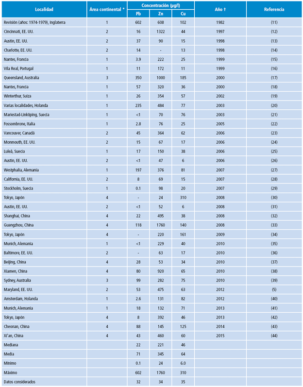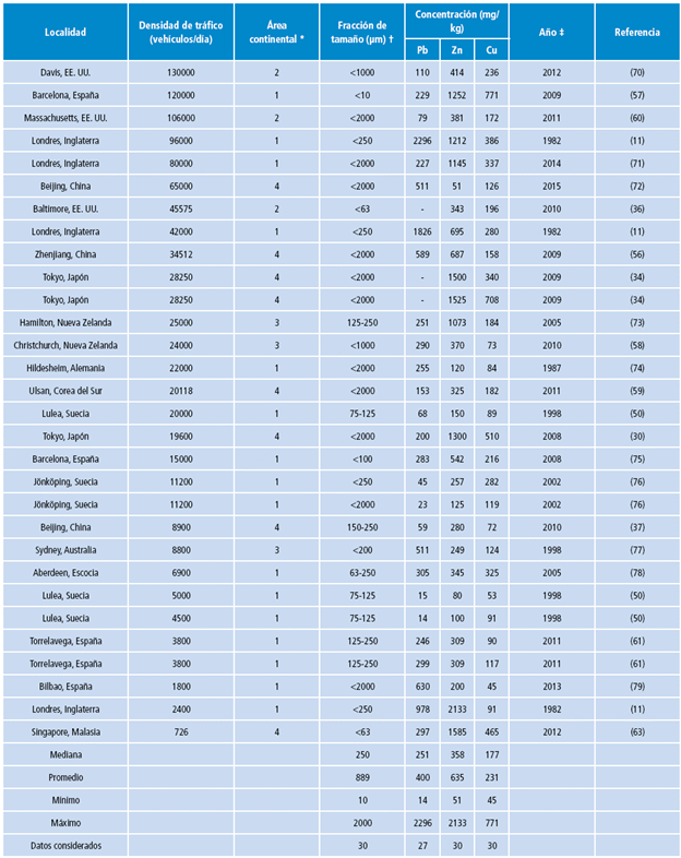 Por último, los resultados sugirieron una variabilidad continental en las concentraciones de metales pesados en la fracción soluble de la escorrentía vial. Las medianas de las concentraciones de Pb, Zn y Cu de países europeos fueron entre 47% y 203% superiores a las registradas en Norteamérica, siendo las medianas de países asiáticos al menos 187% superiores a las norteamericanas. Es probable que estas diferencias se registraran debido a que la información asiática correspondió a áreas densamente urbanizadas de ciudades de China (Shanghai, Guangzhou y Beijing) y Japón (Tokyo). Kayhanian et al. 48 reportaron resultados similares y mencionaron que una de las posibles razones para estas diferencias fue la menor densidad de vehículos por kilómetro registrada en Norteamérica. Lo anterior sugiere un control diferenciado por parte de las instituciones de salud pública y ambiental, es decir, con respecto a las zonas urbanas densamente pobladas (habitantes/hectárea) y con elevadas densidades de tráfico (vehículos/día).
