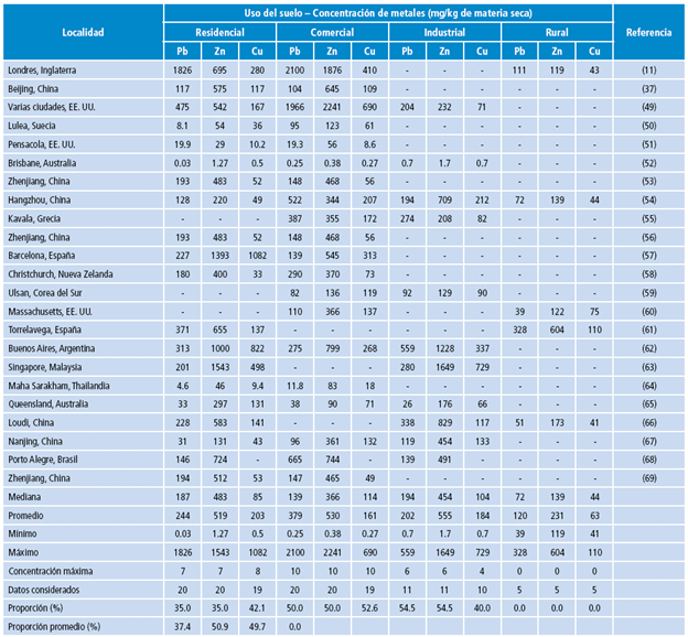 La Tabla 3 presenta una revisión de las concentraciones de metales pesados asociados con los SV para diferentes usos del suelo (recolectado en tiempo seco): residencial, comercial, industrial y rural. Se observó la existencia de amplias variaciones en las concentraciones según el uso del suelo (valores mínimos y máximos). Lo anterior sugirió una exposición de la población residente y usuaria de los corredores viales bajo un amplio rango de concentración de metales pesados, independiente del uso del suelo.