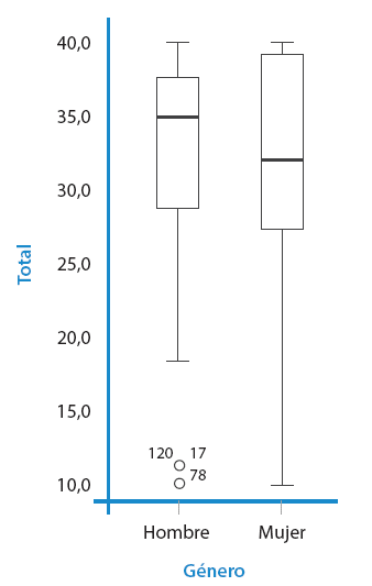 Como lo muestra la Figura 1, la autoeficacia no fue afectada significativamente de acuerdo con la edad, pues se comportó de modo similar. Sin embargo, en esta gráfica de box-plot se encuentran los casos de dos mujeres y un hombre -registrados en la base de datos con su respectivo código- ubicados en el rango de edad entre 46 y 55 años, que reportaron niveles mínimos de autoeficacia.