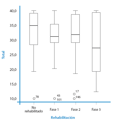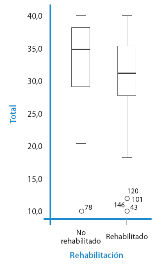 De acuerdo con la Figura 3, los pacientes no rehabilitados tendieron a mantener un nivel de autoeficacia general ligeramente mayor que el de aquellos rehabilitados. Se manifestó una diferencia de 5 puntos en la escala entre la mediana de la autoeficacia general de los no rehabilitados y la de los rehabilitados. Cabe anotar que se dieron casos de la muestra del grupo de rehabilitados con niveles de autoeficacia mínimos -puntajes entre 10 y 15, correspondientes a los códigos 43, 101, 146, 120-. Estos casos se consideraron outliers.