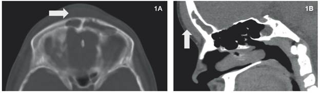 Figura 1: 1A y 1B: Tomografia de cráneo corte axial y sagital. Se observa material con densidad de tejidos blandos en seno frontal, con engrosamiento de los tejidos blandos (flechas) y sin erosión de la tabla ósea.