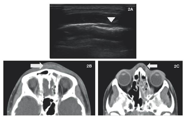 Figura 2: 2A: La imagen ecográfica confirma engrosamiento de los tejidos blandos, asociado a colección liquida con septos finos en su interior y disrupción del hueso frontal (cabeza de flecha); 2B y 2C: Escanografia axial con medio de contraste de senos paranasales. Material con densidad de tejidos blandos, que ocupa celdillas etmoidales y seno frontal, con engrosamiento de tejidos blandos en región frontal y dorso nasal, asociado a colección liquida (flechas).