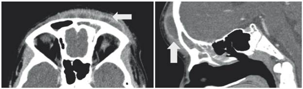 Figura 3: Tomografía de SPN en cortes axial y reconstrucción sagital, donde se aprecia material con densidad de tejidos blandos en seno frontal, relacionado con colección liquida prefrontal con realce periférico (flechas).