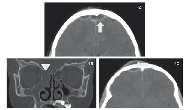 Figura 4: Escanografía de senos paranasales en cortes axiales y reconstrucción coronal, donde se aprecia colección de tipo epidural frontal (4A, flecha), vinculado con material con densidad de tejidos blandos etmoidomaxilar bilateral (4B, punta de flecha) y colección liquida prefrontal (4C, flecha).