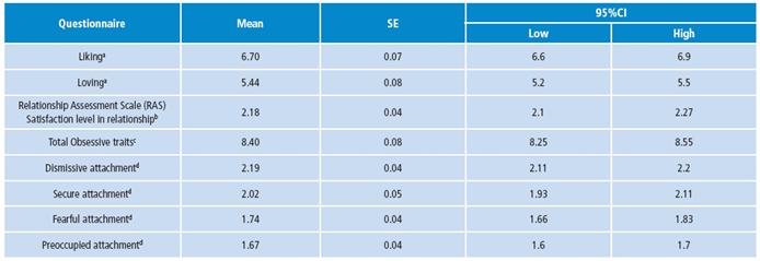 Table 1: Estimation of some loving and liking features, obsession and attachment styles of students in a relationship