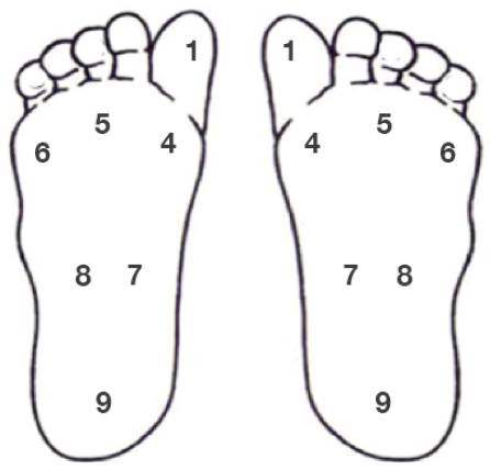 Se aplicó la estesiometría para determinar la sensibilidad en las plantas de los pies, con gramajes que van de 0.16g a 4g. La presión se aplicó sobre siete puntos de la superficie plantar de los participantes (Figura 1) y se establecieron puntajes entre 2.83 y 3.61 como percepción normal, establecidos en el protocolo de acuerdo con Toledo & Barela 6.