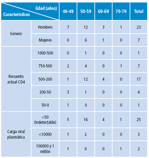 El estudio fue realizado con pacientes de una IPS de Bogotá D.C. entre agosto del 2013 y mayo del 2014. La muestra fue seleccionada a conveniencia y la información clínica de los 30 pacientes seleccionados fue obtenida de los registros médicos de las historias clínicas y de la base de datos de la cuenta de alto costo (CAC) del Programa de Atención Integral de VIH del Hospital Universitario Mayor, un programa caracterizado por una cohorte de población adulta mayor: el 51% de los pacientes atendidos son >50 años y el 40% lleva entre 16 y 20 años de tratamiento 16.