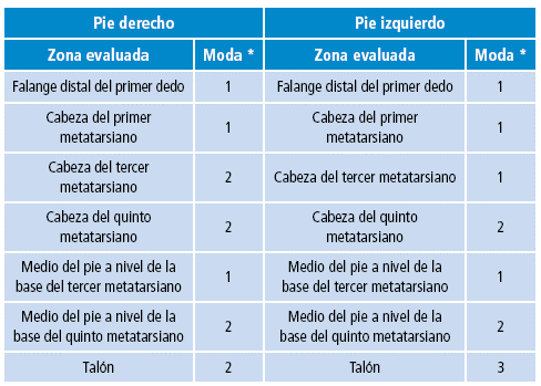 La prueba de sensibilidad evidenció menor capacidad de discriminación en la falange distal del primer artejo y en la cabeza del primer metatarsiano (zonas 1 y 4) (Figura 1 y Tabla 2). El 27% de los participantes presentaron hiperqueratosis y el 33% resequedad en la piel de las plantas de los pies.