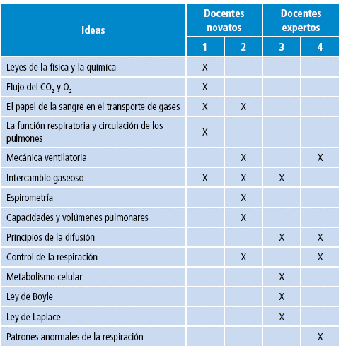 En la Tabla 1 se relacionan los conceptos o ideas centrales propuestos por los docentes. Los docentes expertos proponen conceptos menos descriptivos de la fisiología y más enfocados en los principios de la física y la bioquímica, aplicados a las capacidades y los fundamentos del metabolismo celular necesarios para explicar los fenómenos fisiológicos relacionados con la respiración celular y el intercambio gaseoso. Los docentes novatos se centraron más en priorizar los conceptos fisiológicos en sí mismos.