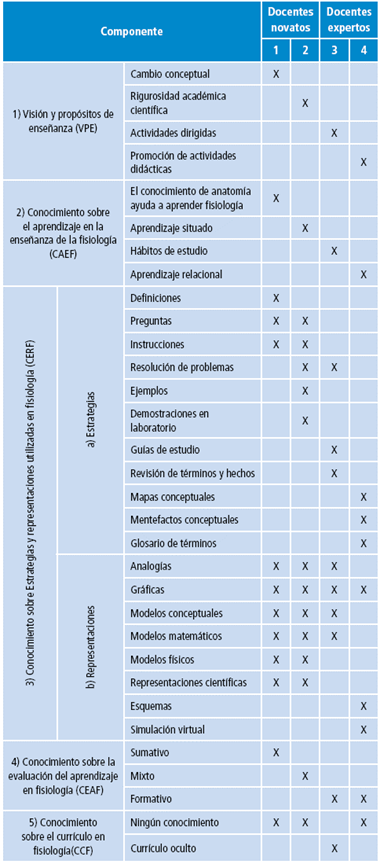 A continuación, se presenta una síntesis general sobre la conceptualización de cada uno de los componentes del CPC, resaltando los aspectos diferenciadores entre los docentes expertos y novatos (Tabla 2).