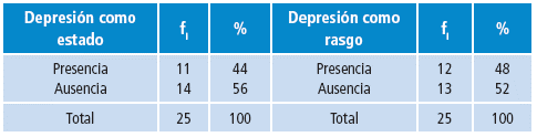 En cuanto a los resultados obtenidos en el IDER que se presentan en la Tabla 1, se identificó que el 44% de los evaluados presentaba depresión como estado y el 48% depresión como rasgo.