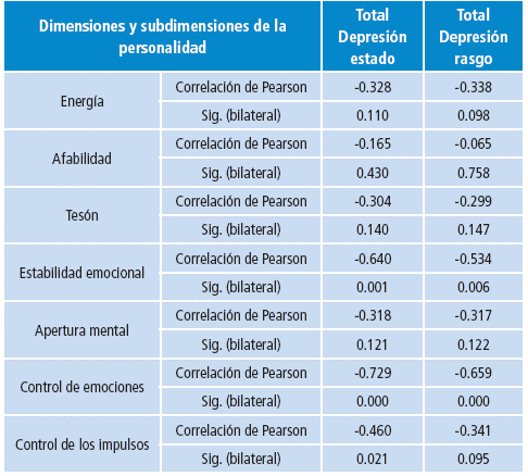Además, se hallaron correlaciones negativas moderadas (p<0.05) entre la dimensión de la personalidad estabilidad emocional y la depresión como estado (r=-0.640), entre esta misma dimensión y la depresión como rasgo (r=-0.5340) y entre la subdimensión control de impulsos y la depresión como estado (r=-0.460). Lo anterior indica que al obtener mayores puntuaciones en depresión como estado o como rasgo, se obtendrán menores puntuaciones en la dimensión estabilidad emocional o en la subdimensión control de impulsos.